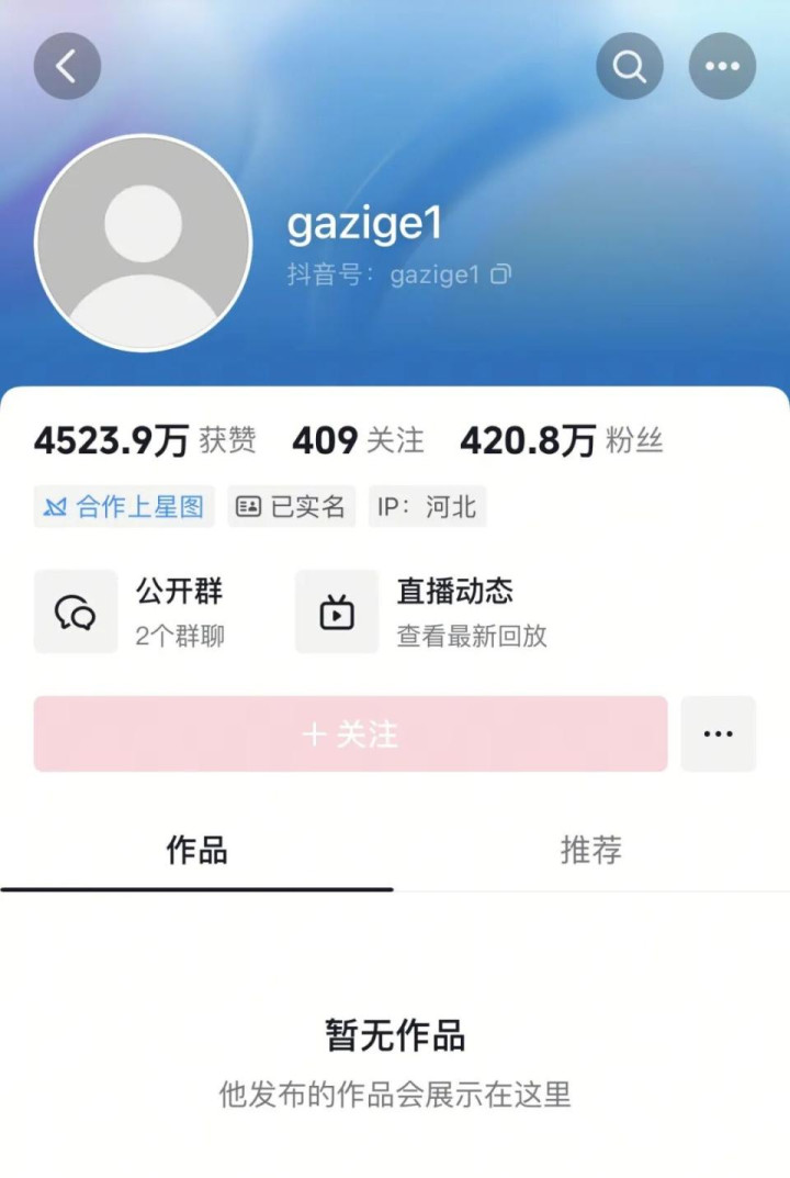 9月19日,“嘎子谢孟伟”的抖音号异常,显示“该用户被禁止关注”,其抖音粉丝420.8万。