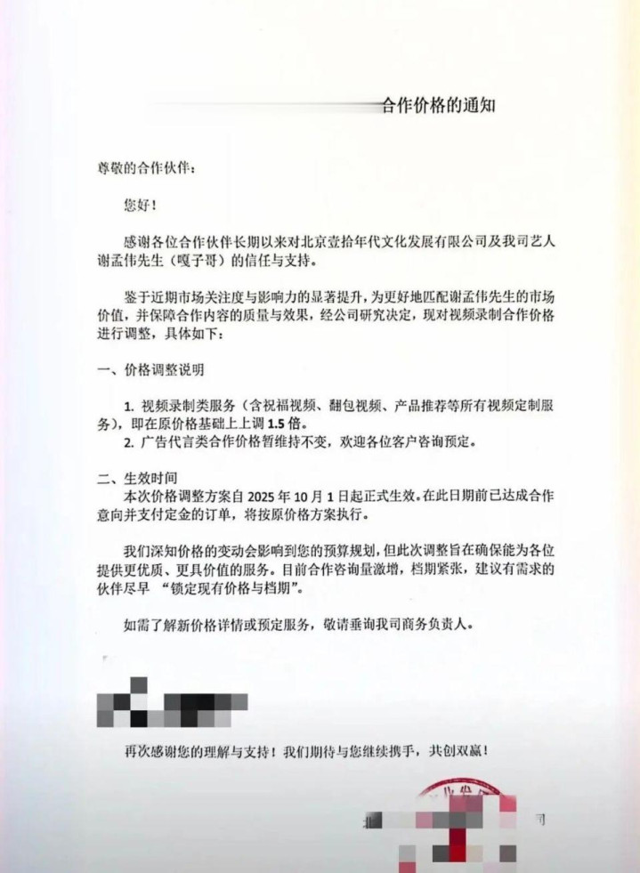 9月26日,有网友在网络平台发布了一则《关于调整谢孟伟先生视频录制合作价格的通知》,通知中称,鉴于近期市场关注度与影响力的显著提升,为更好地匹配谢孟伟先生的市场价值,并保障合作内容的质量与效果。经公司研究决定,现对视频录制合作价格进行调整,视频录制类服务(含祝福视频、翻包视频、产品推荐等所有视频定制服务),即在原价格基础上上调1.5倍。